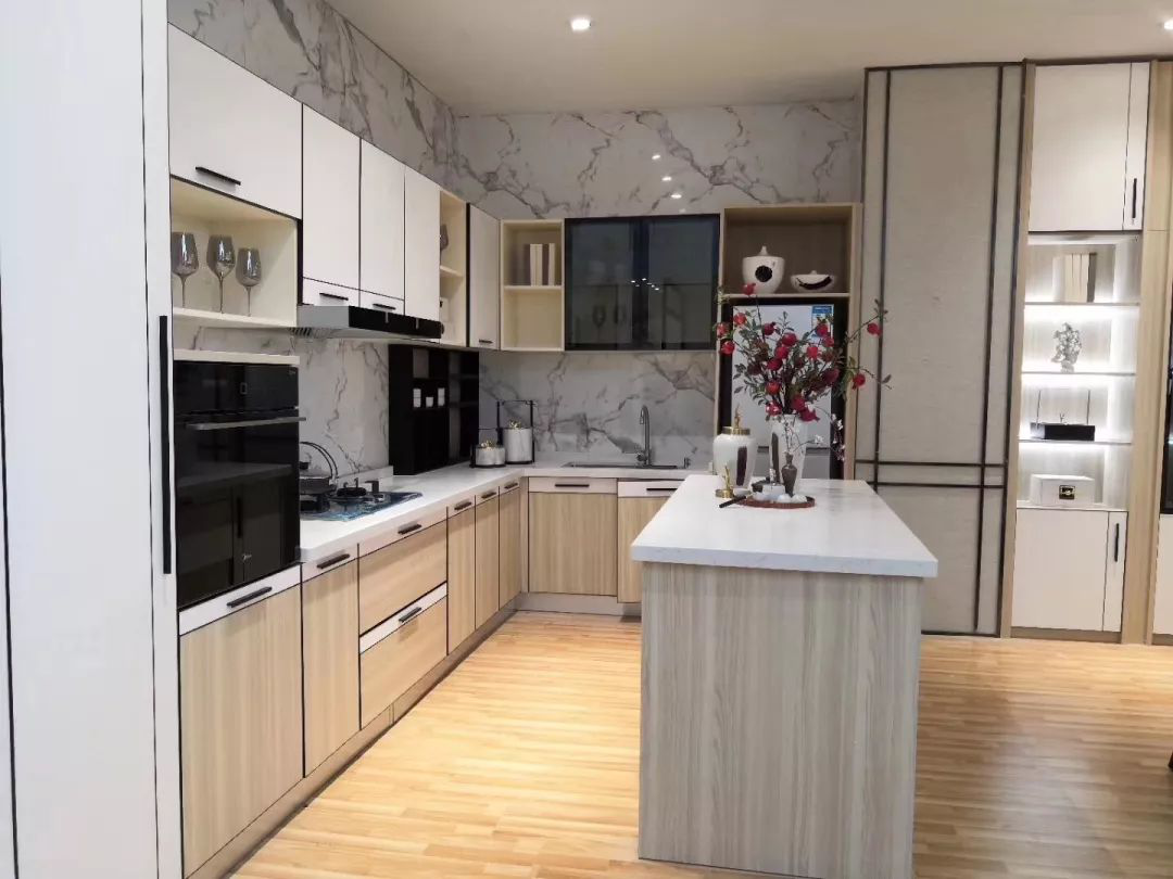 新的全係列(liè)產品為 “唐風漢韻(yùn)”,該(gāi)係列(liè)的特點為:黑(hēi)色氧化砂的硬朗線條,配合白色岩石紋的雪舞江山柔美(měi)麵(miàn)材,仿佛勾(gōu)勒出(chū)一幅(fú)中國潑墨山(shān)水畫的意境。再加以冰河紋水曲柳的淺(qiǎn)木(mù)色的鑲嵌,像(xiàng)是身臨可(kě)以眺望壯麗(lì)山河的靜美園林(lín),留住(zhù)了古色韻味(wèi),卻又剔除了無關緊要的繁瑣。黑色(sè)線條勾勒的拉手(shǒu)和線條,使得色彩搭配十分契合,給整體空(kōng)間添加了更加明朗的輪廓感,並(bìng)起到了整體延伸(shēn)的效(xiào)果,將中式(shì)韻味演(yǎn)繹的淋漓盡致。