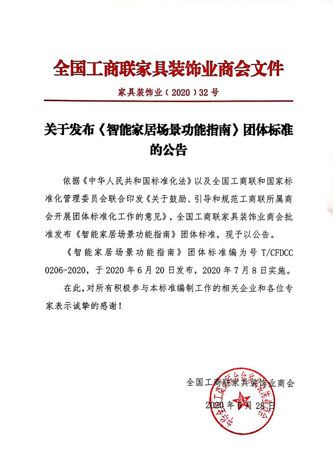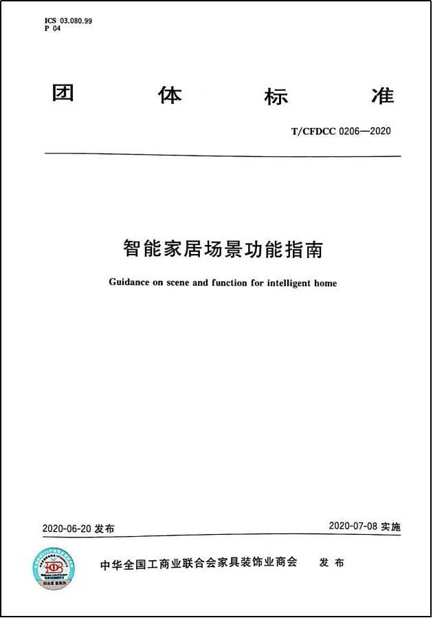 由全國工商聯家具裝飾業商(shāng)會組織(zhī)行(háng)業(yè)優秀(xiù)企業起草的《智能家居(jū)場(chǎng)景功能指南》(標準號:T/CFDCC 0206-2020),於(yú)2020年6月20日發布,並於2020年7月8日起正(zhèng)式實施。