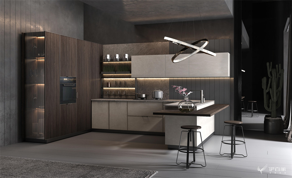 極簡掛牆板係統,層板與黑(hēi)色鋁框玻璃門設計,減(jiǎn)弱空間灰度的衝擊(jī)力。高低錯落島台設(shè)計,豐富空間層次感,營造溫馨精致的細膩質感(gǎn)。