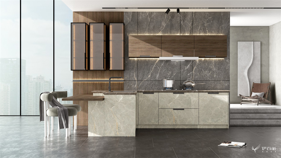 深木(mù)色吊櫃內嵌層板燈帶,蔓延出虛實韻律的時尚高級感。岩板紋理島(dǎo)台與休閑(xián)桌的組合,觸發了平衡藝術的辨識度與愉悅性,成功打造了三分奢華七分素雅的交流空間!美食上桌(zhuō),歡笑一堂,與家人一起沉醉(zuì)於此番愜(qiè)意。