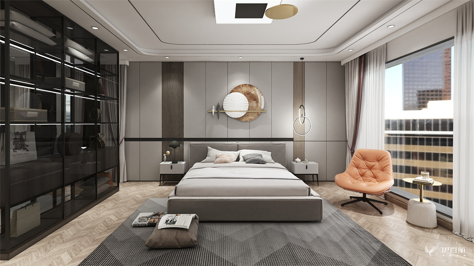 主臥維持與外部空間同樣的格調,保(bǎo)持了一貫的輕奢極簡設計。木色與玻璃隔斷櫃的結合,隔而不(bú)斷,巧妙劃分臥室空間,讓空間更有層次感,打造悠閑安適的場域特性。