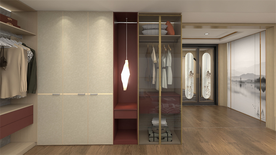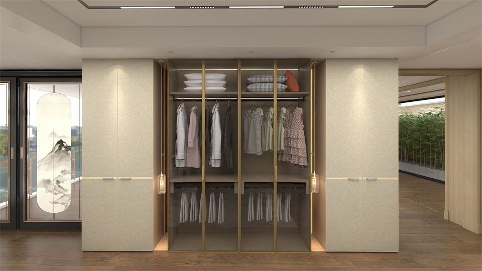 衣櫃采用(yòng)對稱式結構,居中的位置設置了(le)內透(tòu)光灰玻門的收納設計(jì),在明裝邊角燈的交相輝映下,心愛的衣物一目了然盡收眼底,讓(ràng)穿衣搭配成為一種愉悅的期待與美好(hǎo)的享(xiǎng)受。