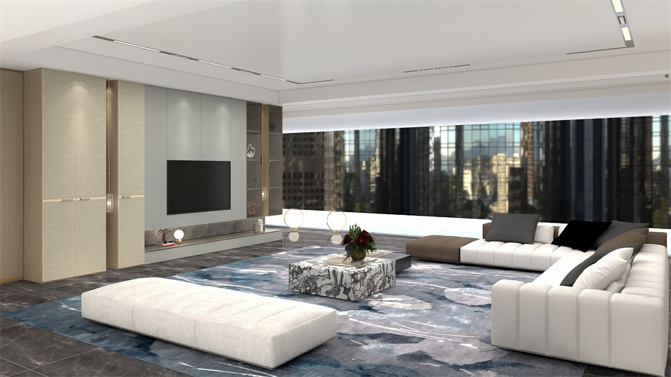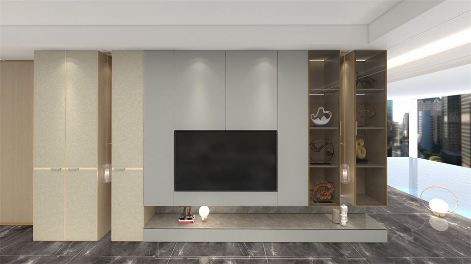 按特定(dìng)比例(lì)劃分,收納與(yǔ)展示一目了然的電視櫃鋁(lǚ)框玻(bō)璃門的運(yùn)用,豐富了櫃體實用性的同時,打(dǎ)破了空間布局的靜謐感。原創皮質拉手重塑時光質感(gǎn),令空間的生命氣息詩意盎然。