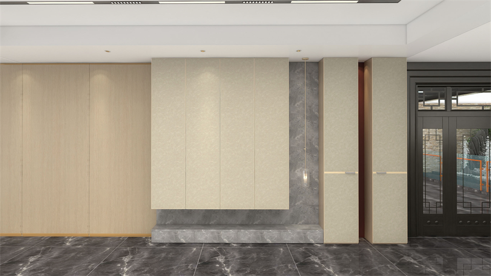 懸空置物的(de)幾何設計語言伶俐的穿行在空間之中,鞋(xié)櫃掛式吊燈應用迎合入戶進出場景的儀式感,同時為更換鞋物提供充足的(de)照明。