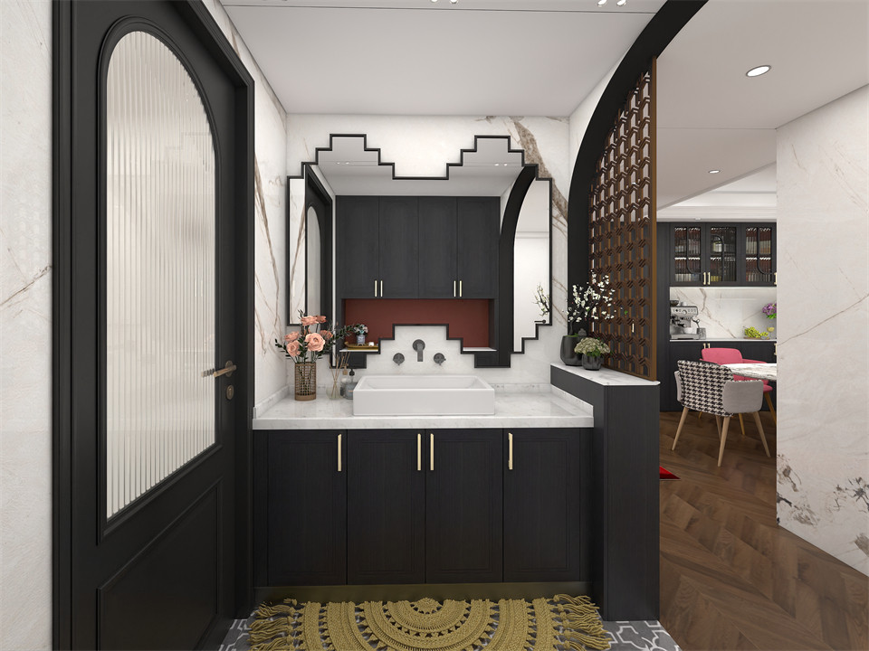 將洗漱台(tái)做外移設計,不僅提高(gāo)了使用效率,也讓平時洗手變得更加方便。低飽和色度的EO100-煙熏橡櫃(guì)門/同色(sè)櫃體混搭胭脂紅、冰淩台麵,將實用性與藝術性糅合一體賦予空間愜意(yì)的尺度與氛(fēn)圍為居家生活創造更多的美好享受(shòu)。