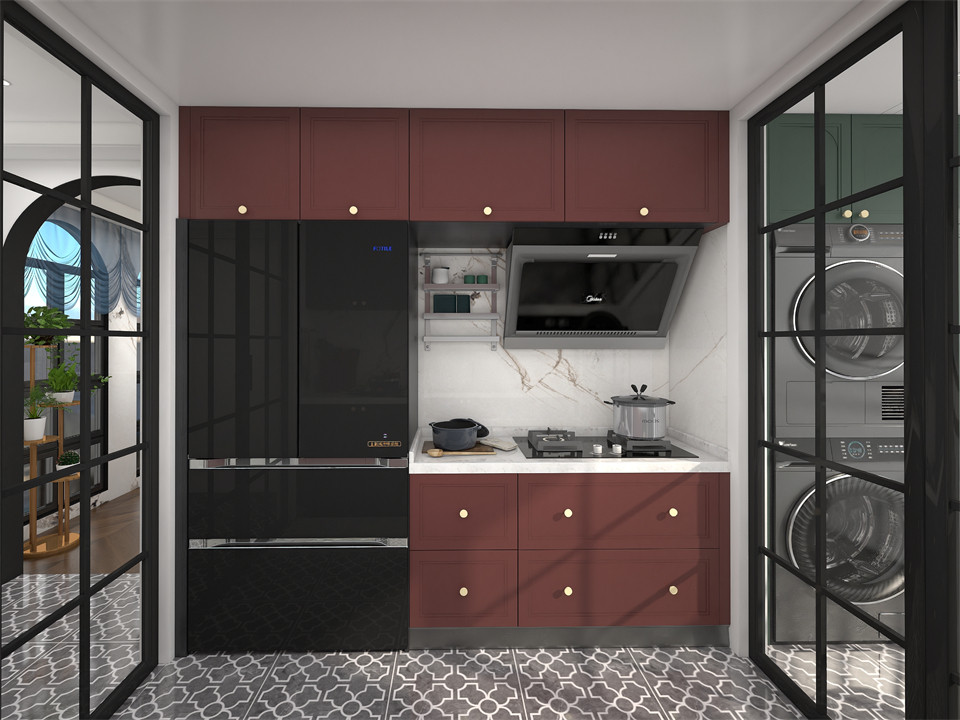 Ⅱ型廚房(fáng)分布讓烹(pēng)飪與洗滌分區進行,互無幹擾EO100-01-阿(ā)瑪尼白紅矩形吊櫃/地櫃門板、不鏽鋼消毒(dú)櫃、冰淩台麵等不同材質相互碰撞,營造出與眾不同的空(kōng)間魅力,賦(fù)予廚房溫暖的生活氣息(xī)