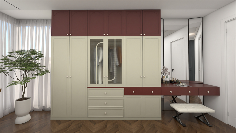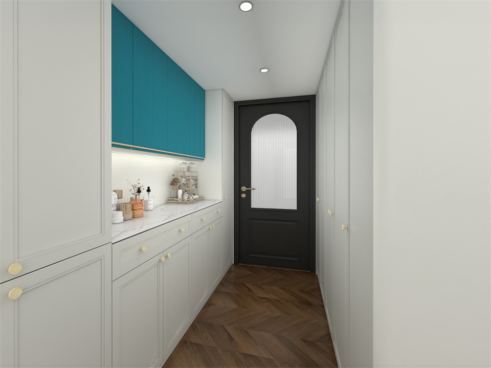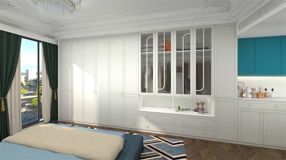次臥掩門(mén)櫃+EO100-06S-阿瑪尼豆綠玻璃門+梳妝台(tái)一體設計,虛實結(jié)合,輕鬆(sōng)收納(nà)四季衣物和化妝小物半圓造型玻璃門作(zuò)為衣櫃點綴,次臥空間層(céng)次豐盈通透呈現一種別致的匠心詩意
