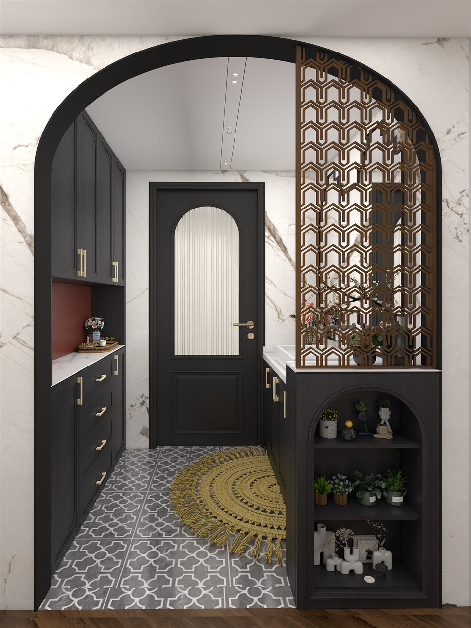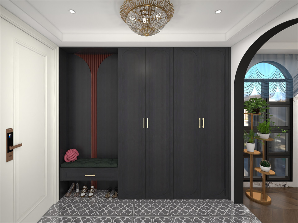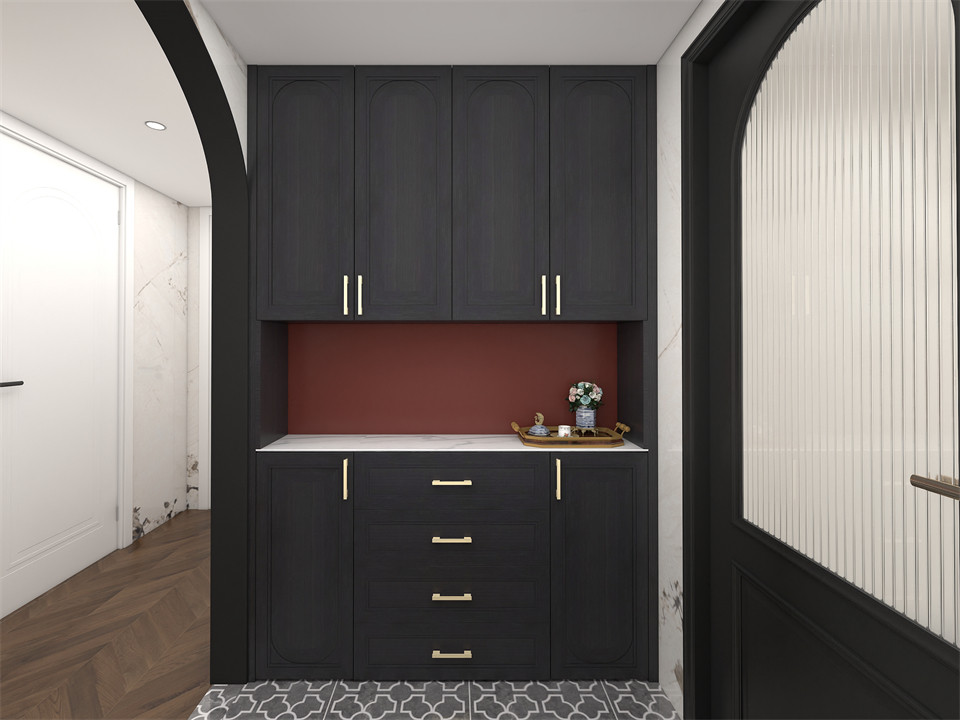 進門左側是玄關櫃,EO100-煙熏橡門板盡(jìn)顯簡約高級,一門到頂的櫃子設計(jì)滿足了鞋子收納需求。換鞋凳+下方懸空設計(jì),方便日常放/換鞋,完美呈現鞋(xié)櫃的功能性(xìng)與觀賞性靜享歸家的舒適愜意。