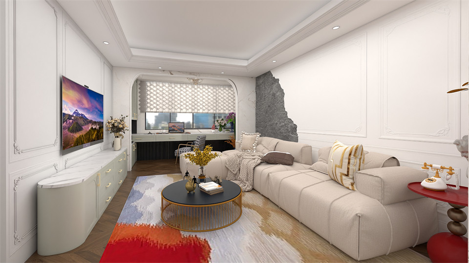 客廳空間以功能結合舒適性為主,餐廳與客廳一體鏈接,加強空間的穿透感自(zì)然原(yuán)木色的EO100-子午灰定製電視櫃與阿爾卑斯(sī)岩板台麵彼此呼(hū)應妥妥將客廳收納拿捏得當,將自然治(zhì)愈的慵懶閑適感直接拉滿。