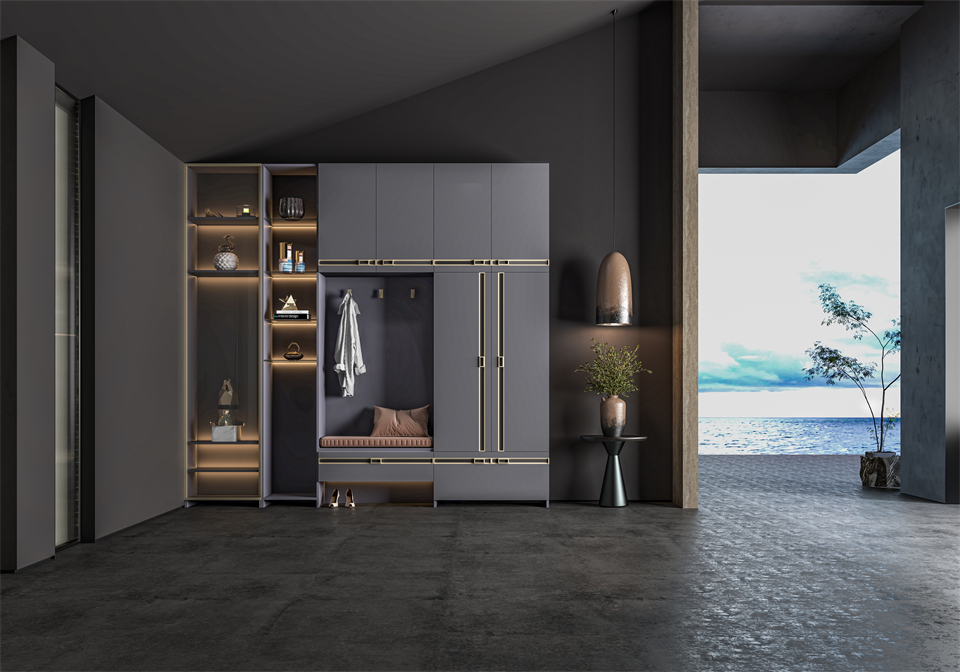 溫潤的(de)基材同暗色深邃色彩搭配呼應,訴說著家靜謐而(ér)優雅的質感。集展示+換鞋凳+掛衣區(qū)+鞋櫃功(gōng)能於一體的玄關櫃,藏露得益的分類存放設計,調(diào)動起空間(jiān)的互動與生活氣息(xī),慢(màn)調歸家後的品味生活。