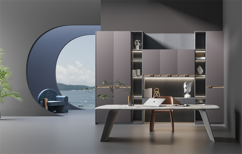 集收納、展示、辦(bàn)公、閱讀功能於一體的書房,空間(jiān)氛圍表達更(gèng)加(jiā)豐富(fù)、和諧。溫暖沉穩的斜赤木櫃身,加以層板結構錯落布局設計,在平衡了(le)實用需求和美感享受的同時,還創(chuàng)造出鮮亮輕(qīng)透的空間特色(sè)。奢而不華,簡(jiǎn)潔大氣,更(gèng)添墨香詩(shī)意。
