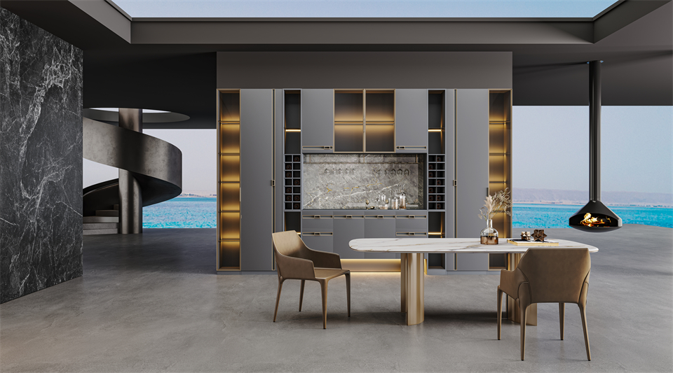 深色(sè)與光影的利落碰(pèng)撞,開放式結構的(de)大(dà)膽布局,讓人產生視覺衝擊力,擴大空間的張力。金銀(yín)石與金屬酒格架彼此呼應,網格的酒格架詮(quán)釋“無規矩(jǔ)不成方圓”,如(rú)此這般才是絕妙的設計。