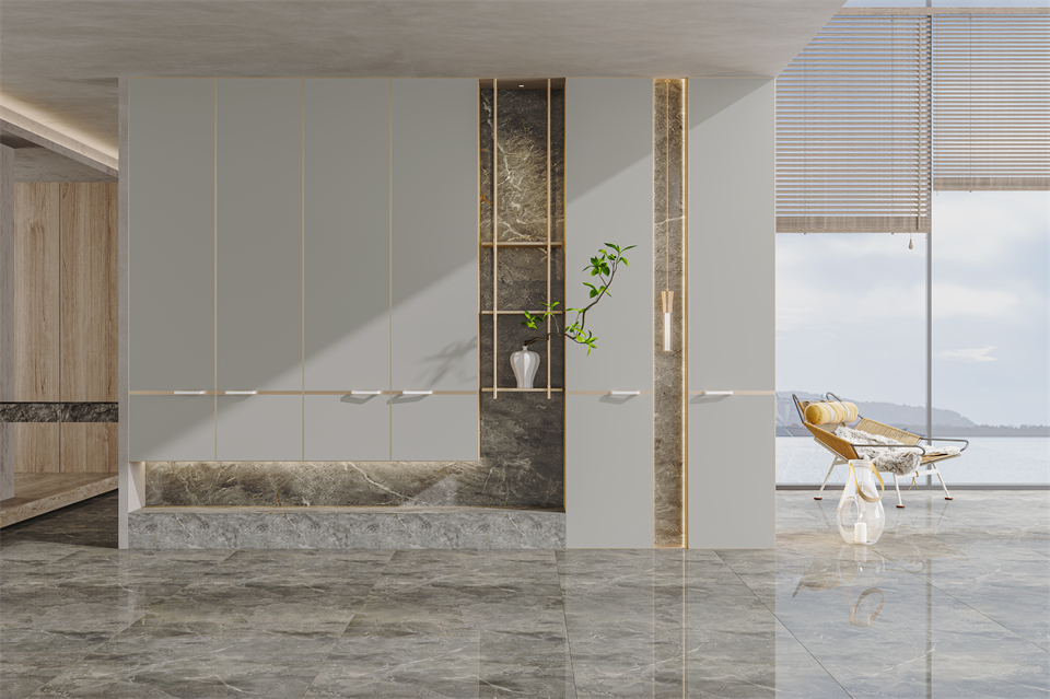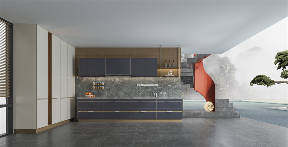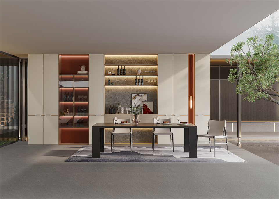 流暢的(de)雲禾木(mù)搭配通透玻璃櫃,在帶有(yǒu)山水畫(huà)意的金銀石岩板的完美映襯下,給餐廚空間注入耐人尋味的延(yán)伸感,引出了靈動輕快的就餐氛圍,打造出獨具東方美學風(fēng)骨的就餐空間。