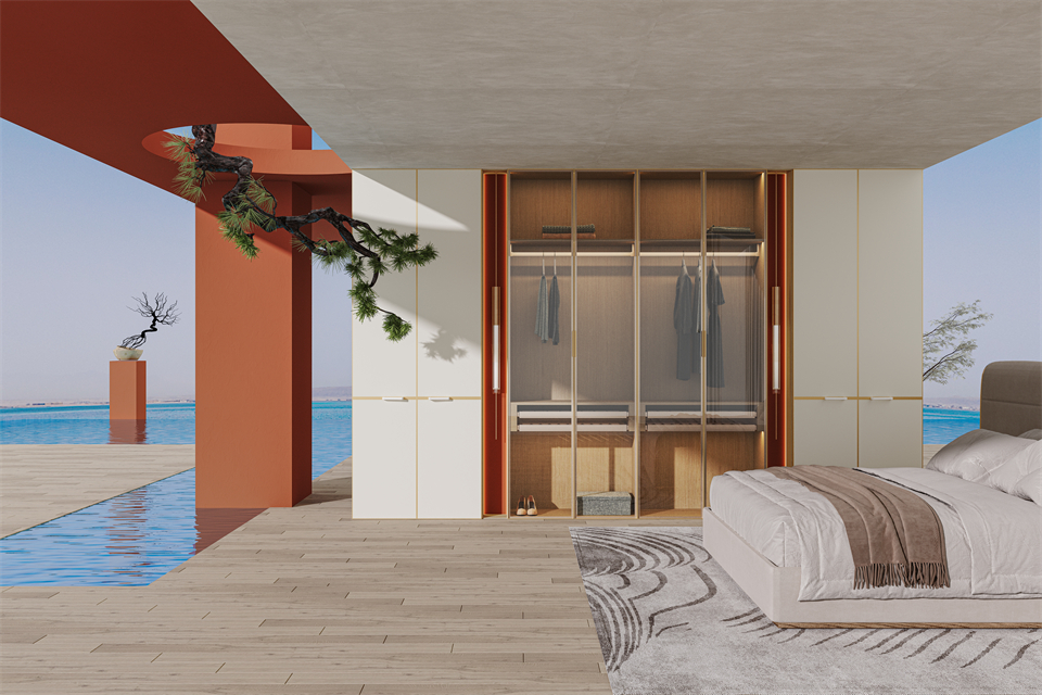 主臥空間將東方元素和現(xiàn)代材質兼收(shōu)糅合,主流木色與低飽和(hé)度色彩的門板/櫃體搭配,內透光玻(bō)璃門收納,兼顧了傳統風韻與現代美感,將新中(zhōng)式的意趣(qù)以輕盈的形態呈現出,於詩意(yì)盎然中暗浮出(chū)恰到好處的美與雅,照亮居者的精神領地。