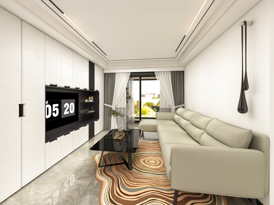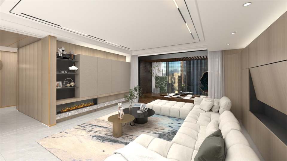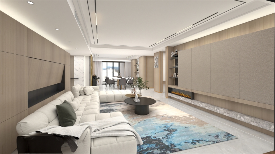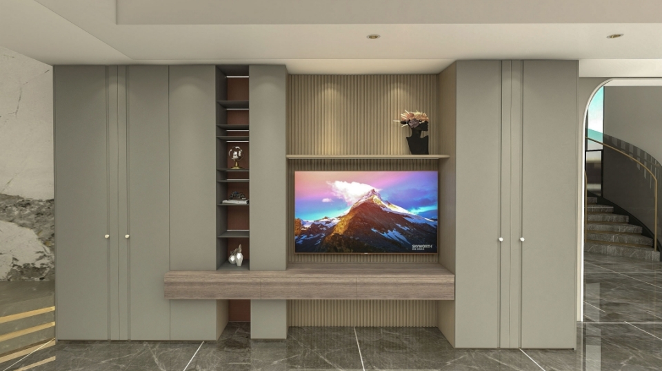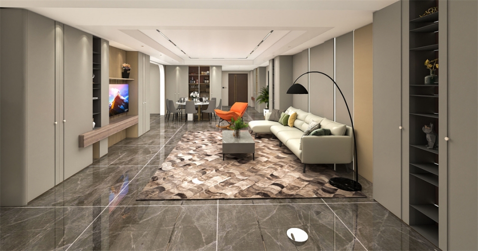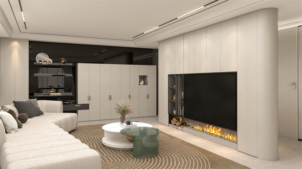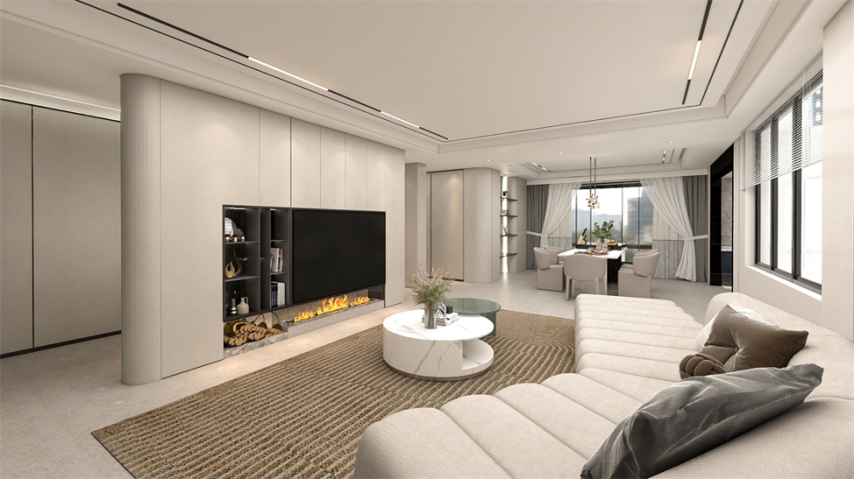 客廳電視櫃采用大麵(miàn)積(jī)的滄露白花色作為主(zhǔ)色調,搭(dā)配(pèi)水磨石地板,渲染出質雅藝術的時尚極簡風格。滿牆電視櫃全包圍設計與帶(dài)燈鋁(lǚ)層板開放格結合,收藏得(dé)宜,簡潔利落。