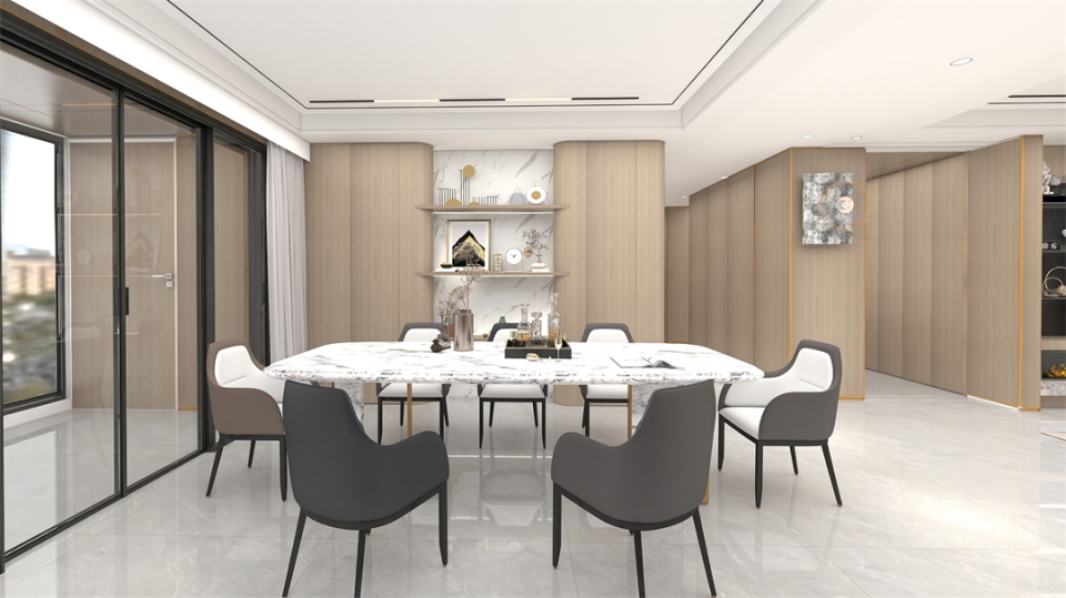客餐(cān)廳(tīng)以白櫟(lì)橡牆(qiáng)板為統籌,賦予空間高級純粹的簡奢美學。客餐(cān)廳一體式設計,讓用餐區域(yù)與會客場(chǎng)景無界相連,實現生活模式(shì)多樣化與互動性。