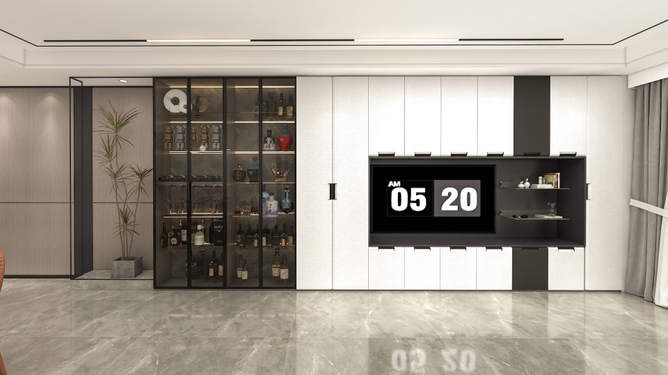 通透的玻璃(lí)櫃門圍合一麵(miàn)及頂的餐邊酒櫃,營造出輕簡明朗的空間視覺。有(yǒu)序排布的超白玻璃帶燈層(céng)板,在收藏展示各類美(měi)酒(jiǔ)、珍品的同時又可(kě)以防塵,帶(dài)來實用性和美觀性的雙重效果。