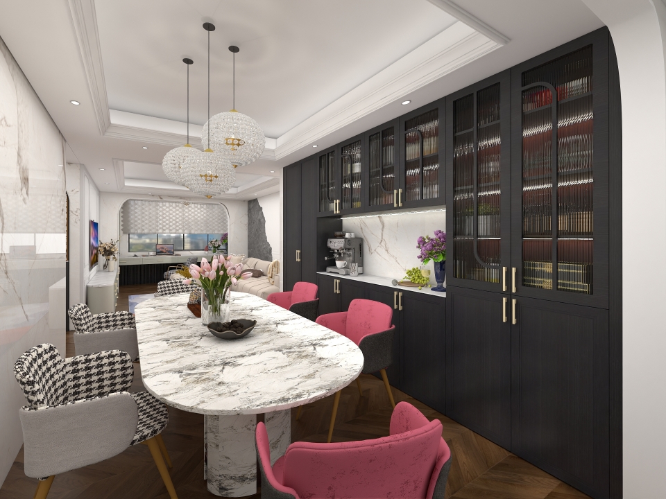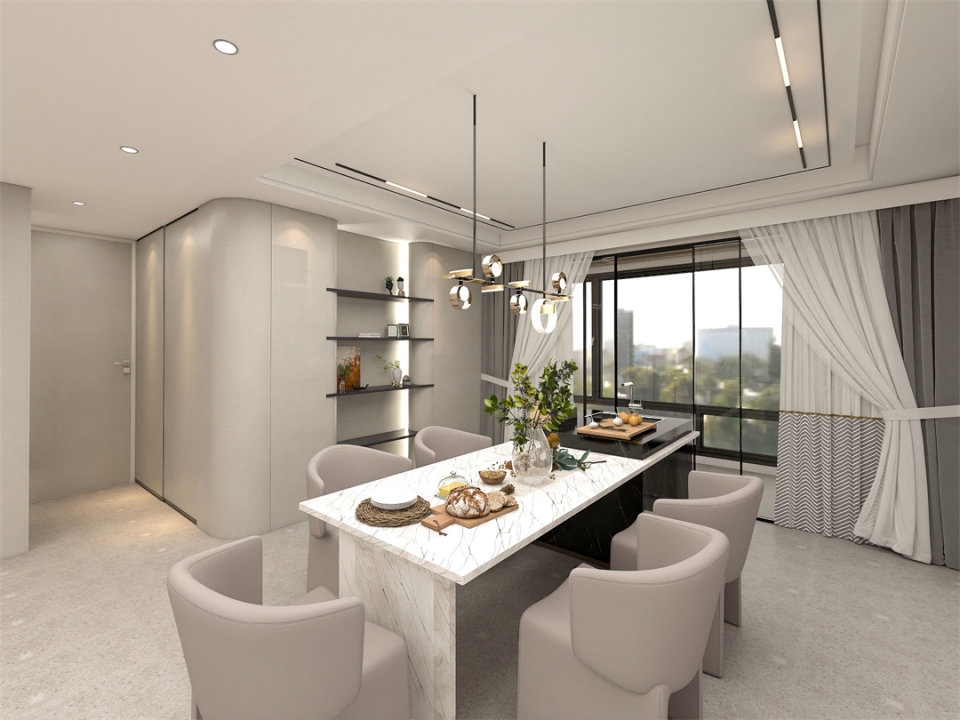 餐廳連接客廳而設,餐廳、西廚(chú)、陽台櫃體自成一係又相互為一(yī)體,讓(ràng)空間功能互為補充。在開放的空間裏,兩(liǎng)側白櫟橡圓弧隱藏儲物櫃以對稱起筆,中間木質層板裝(zhuāng)明裝邊角燈從上而下(xià)懸空分層(céng),儲物、置物、展示皆滿足,衍生(shēng)餐敘空間的無限煙火。