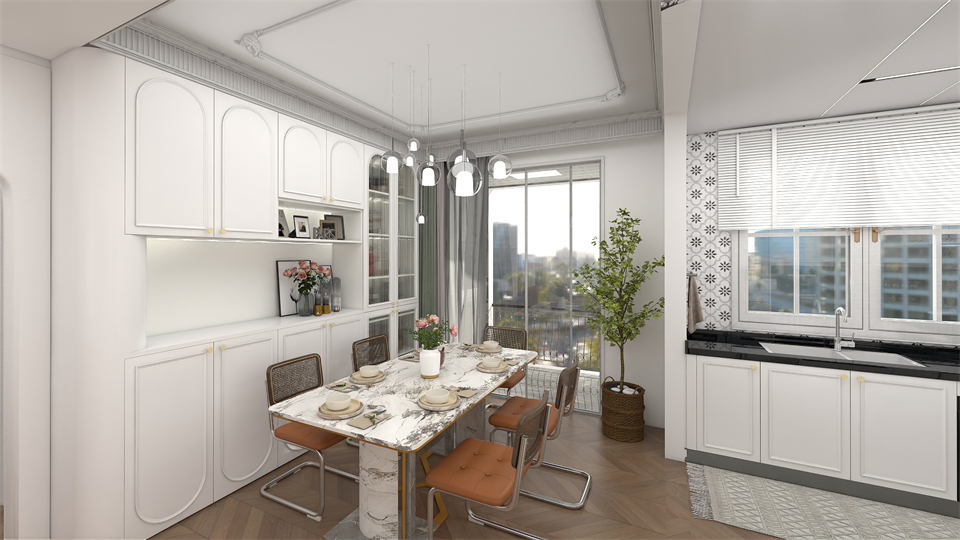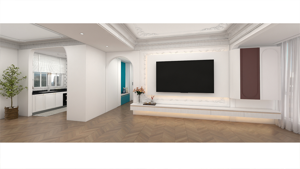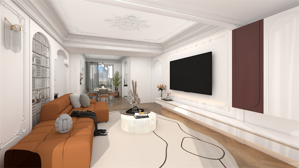 客廳是超大橫廳結構,一邊是寬敞包容的客廳,一邊(biān)是通透明亮的餐廚,既自由(yóu)開放又互相關聯。奶油白電視背景(jǐng)牆的法式(shì)雕花和線條的整體造型,搭配阿瑪尼白(bái)高門(mén)/單(dān)圓(yuán)弧,豐富收納空間的同時,牽引出法式獨有的浪漫情(qíng)韻(yùn),讓客(kè)廳彰顯出別致優雅的(de)清爽通透。