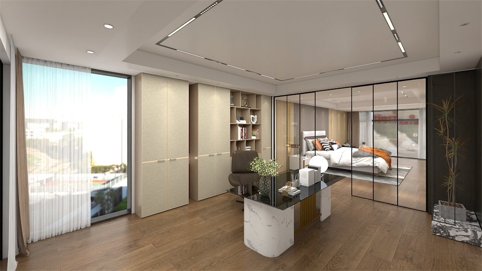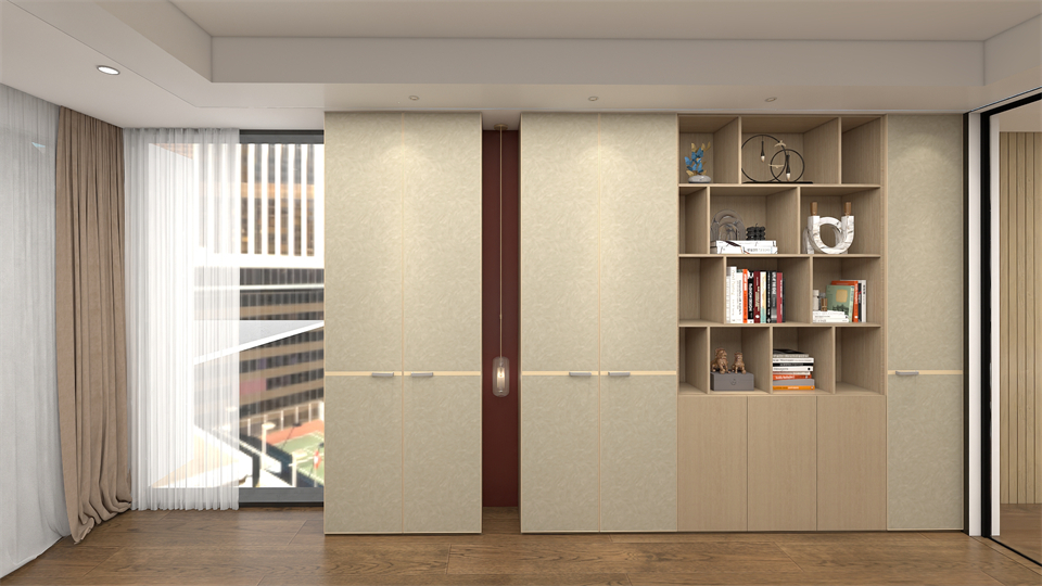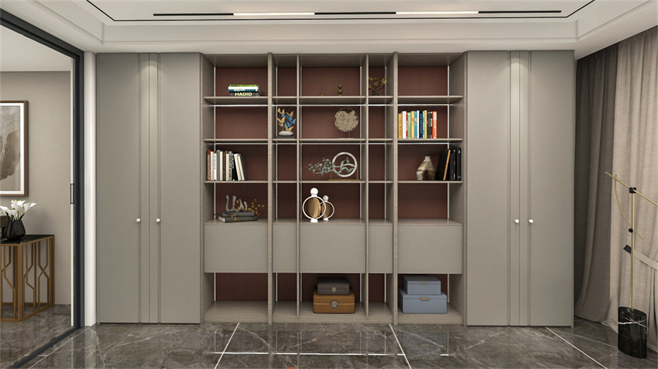 衣(yī)櫃+書櫃+懸空(kōng)穿插書桌/電腦桌自成(chéng)一(yī)體的設計,無論是閱讀辦公,還是收(shōu)納日(rì)常,讓空間呈現出了更多有趣的可能性和多元性。開放互動的雙排入(rù)牆式書櫃布局帶來雙倍的儲藏空間,有藏有露的結構設計,滿足收納和(hé)展示的不同需求,讓陳設的美感和實用(yòng)的功能皆可擁有。