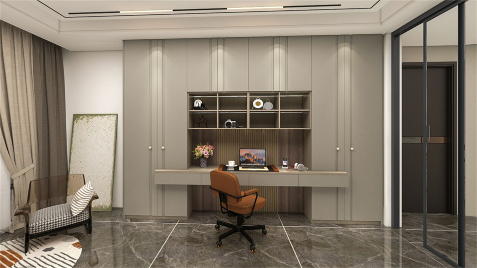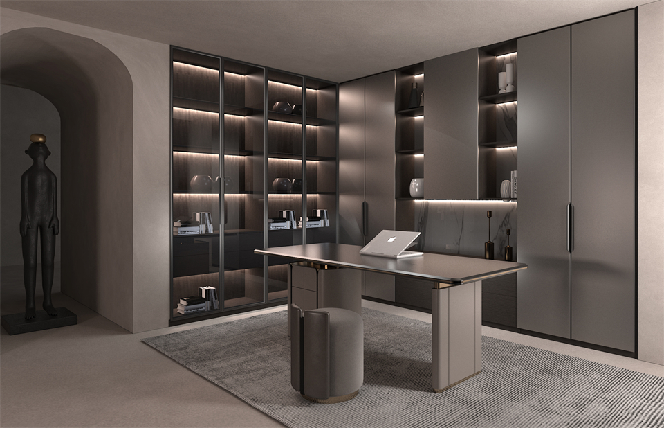 一門到頂設計(jì),一(yī)氣嗬成,簡潔霸氣。深槍灰玻璃門搭配富有(yǒu)金屬感的進口PET拉絲門板,帶給人(rén)前(qián)衛、不受拘束感的(de)同時(shí)更(gèng)添(tiān)通透性。書房空間因融入了更(gèng)多的家(jiā)居功能,空(kōng)間美感亦溫暖而來!