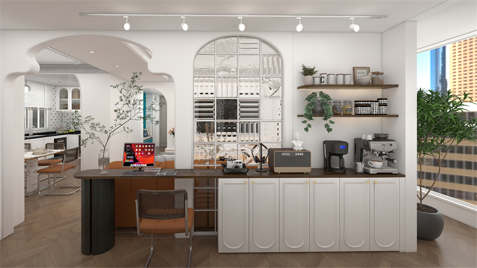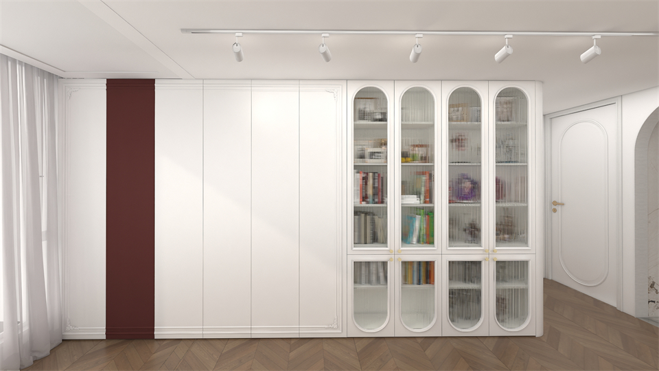 書房與客廳用奶油風造型牆(qiáng)隔起來,獨(dú)立又貫穿 ,空(kōng)間視(shì)覺感大大增強。吸塑門與長虹玻璃門組合,搭配展示櫃(guì)模塊+丹麥咖(kā)啡桌麵、實現了(le)實用性與裝飾性(xìng)的有機統一(yī)。延續整屋色調,書櫃以阿瑪尼白與奶油白配色連貫空(kōng)間,圍繞生活軸線展開(kāi)一場法式美學的(de)浪(làng)漫之旅。縱橫四海,以書為友(yǒu),在此(cǐ)暢享愜意時光。