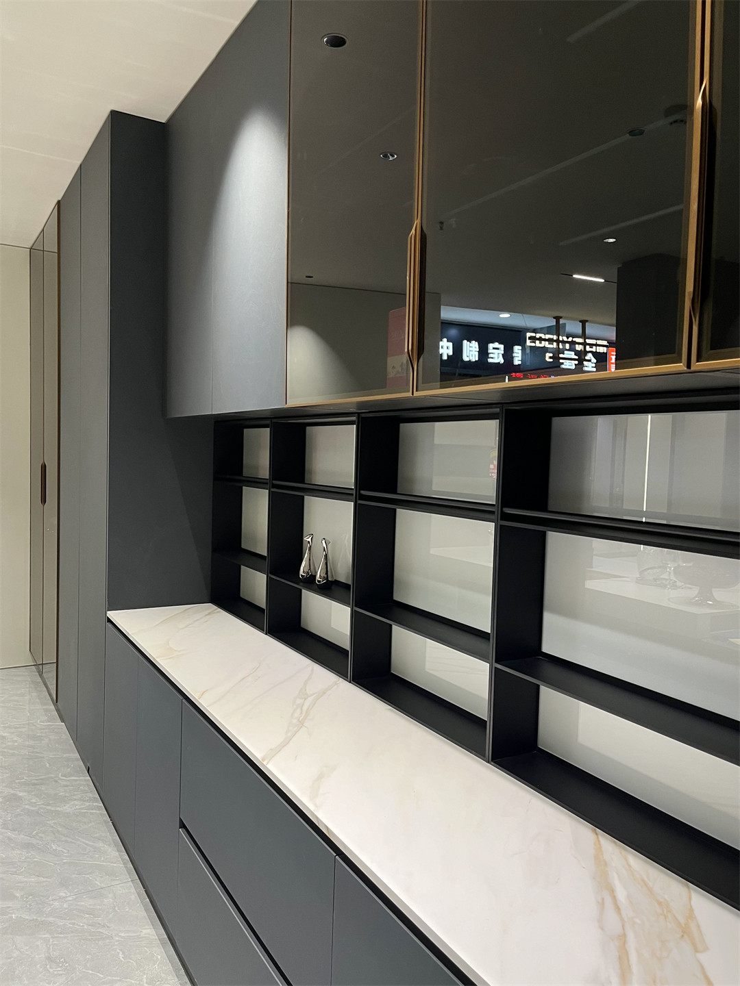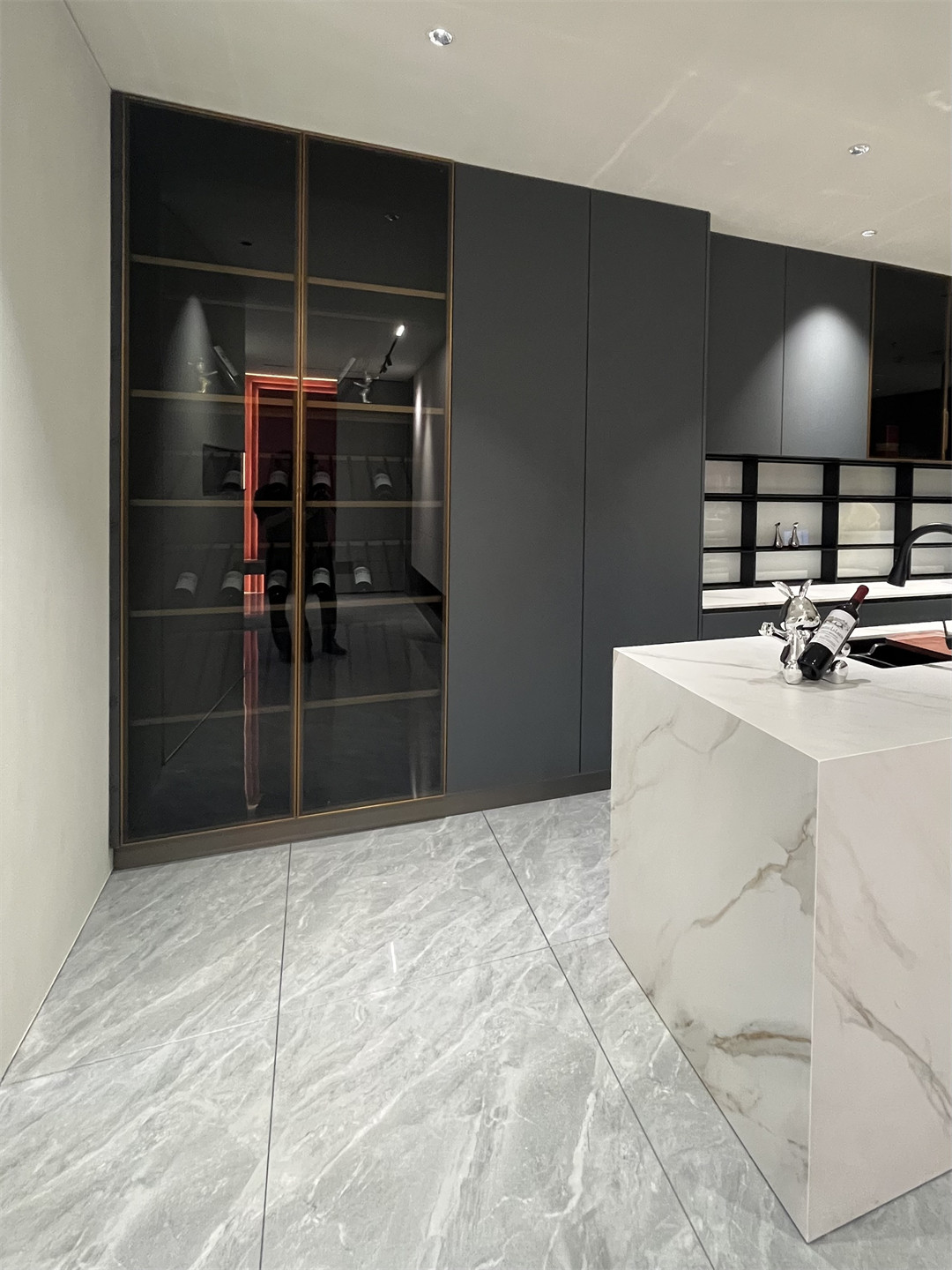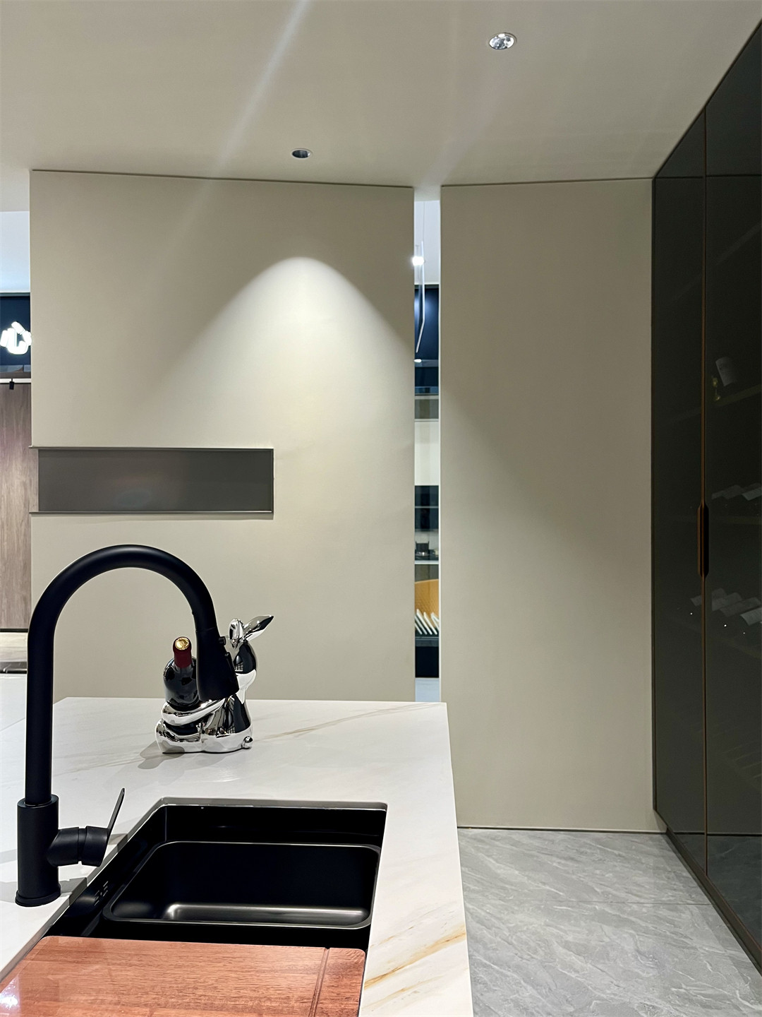 一櫃到頂的黑薔薇原態(tài)木香板櫃體(tǐ)+琬琰青準分子膚啞板櫃門的(de)廚(chú)房(fáng)高櫃與天(tiān)地玻璃門內裝燈帶搭配,隱隱綽綽的光影將生活的品質美(měi)好展現。圓棒圍欄置物架拉絲金鋁層板酒瓶架等材質的(de)選擇與安裝處處流露著匠心,雅致之中皆是時尚美感,還大大豐富了(le)廚房的收納空(kōng)間。