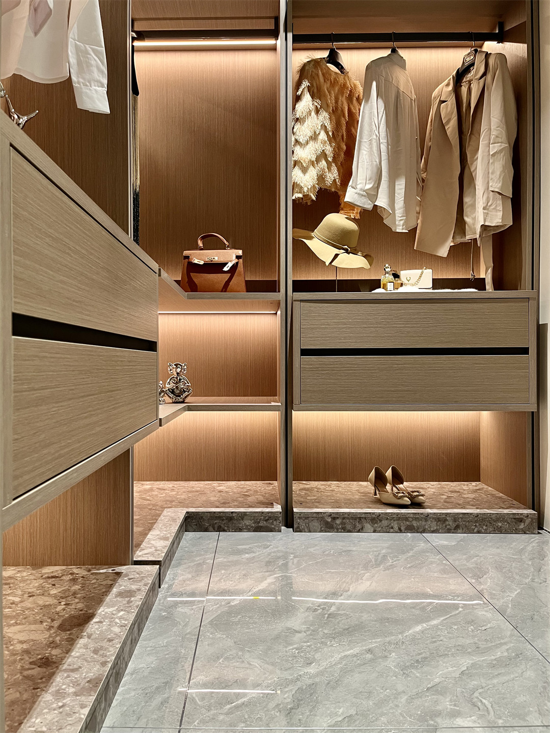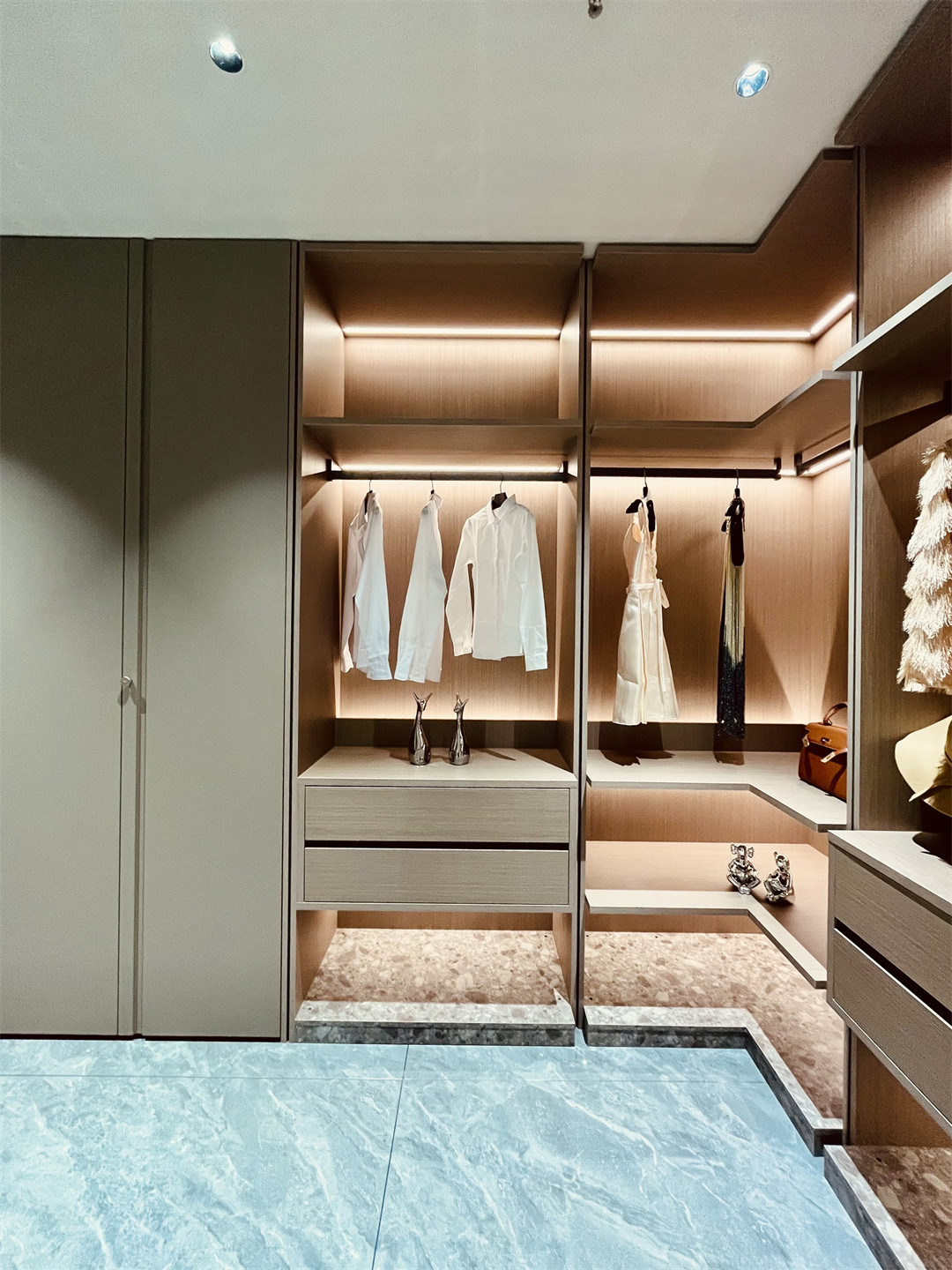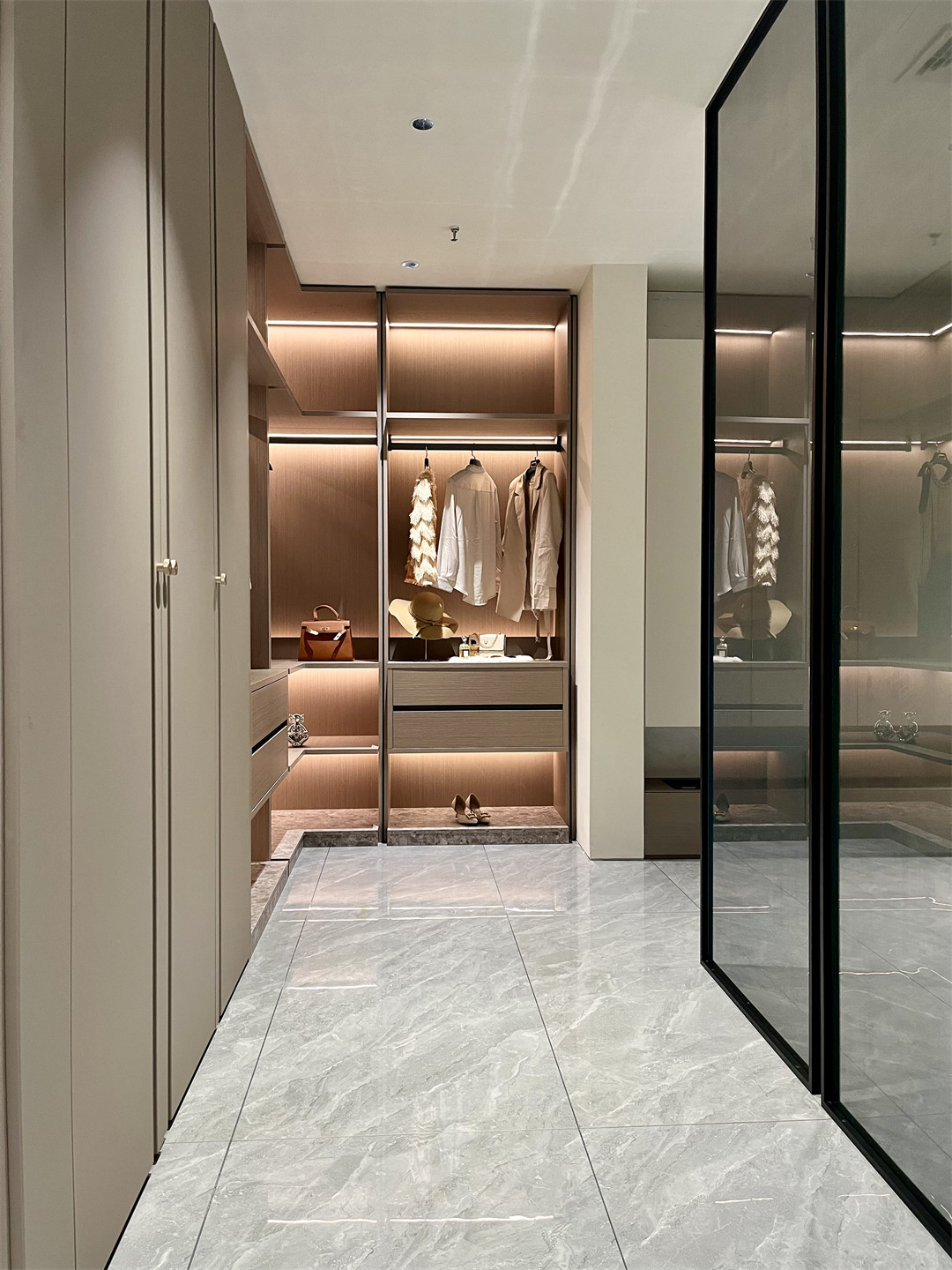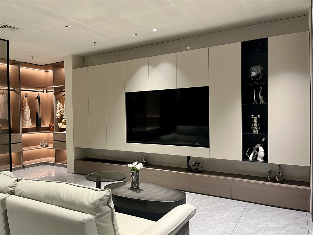 沉穩內斂的梧桐雲木(mù)木質肌理櫃身,細膩清(qīng)朗的羅馬(mǎ)灰門(mén)板,總(zǒng)在第一時間給人帶來(lái)寧靜和安穩;半開放可視(shì)的高(gāo)櫃(guì)陳設設計,在燈光的映射下,塑造出獨有的高級質感。明朗有序的收納空間(jiān),一眼可見的心愛衣物,愉悅而舒適讓人真切地感受(shòu)到(dào)全屋高端定製的(de)純(chún)粹與美好。