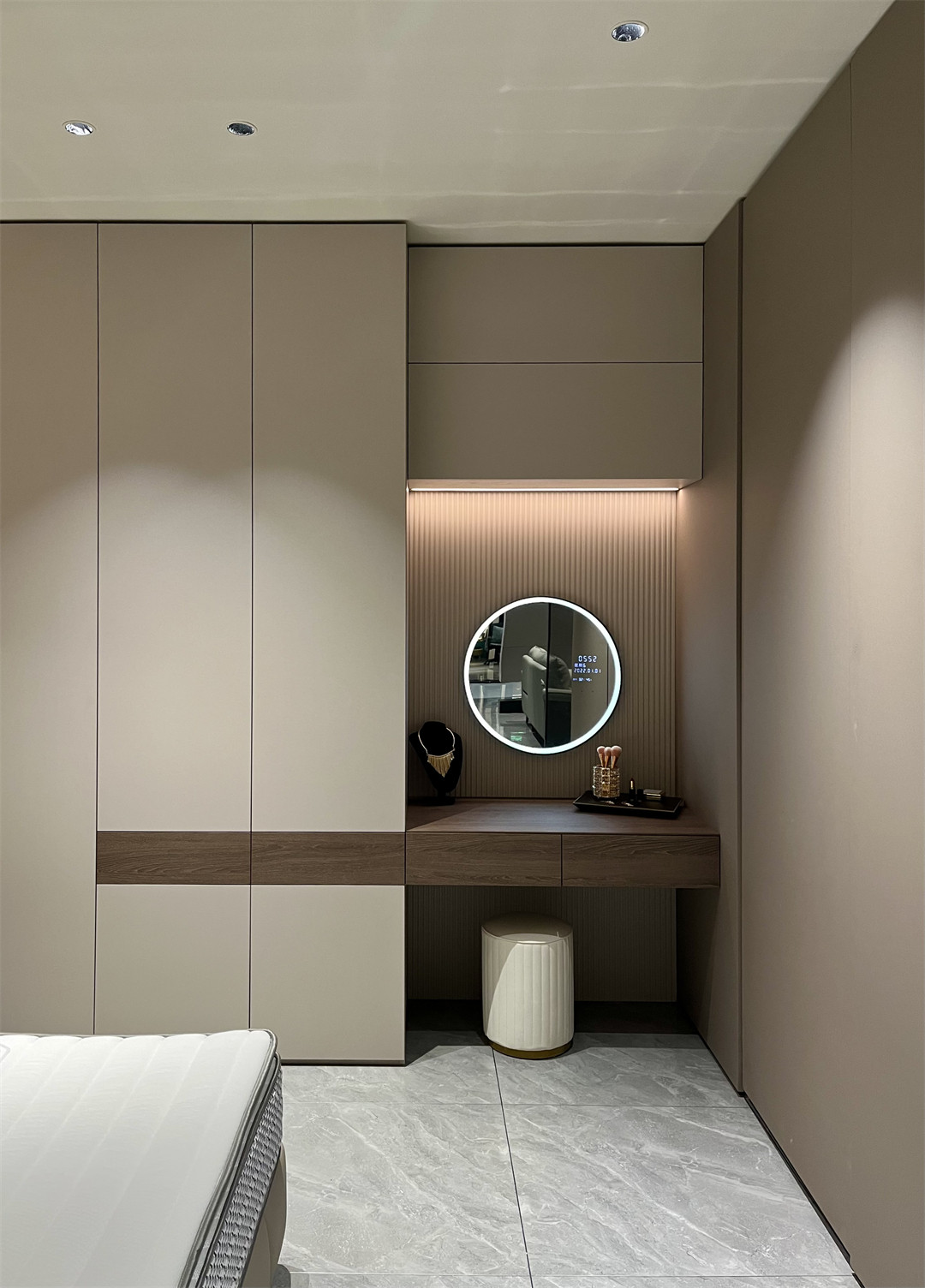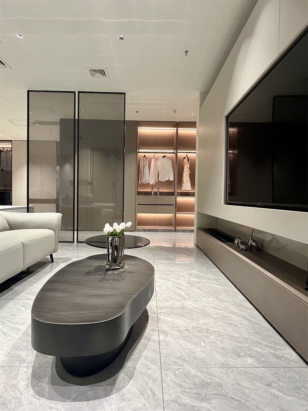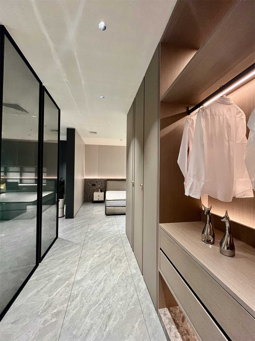 沉穩內斂的梧桐雲木(mù)木質肌理櫃身,細膩清(qīng)朗的羅馬(mǎ)灰門(mén)板,總(zǒng)在第一時間給人帶來(lái)寧靜和安穩;半開放可視(shì)的高(gāo)櫃(guì)陳設設計,在燈光的映射下,塑造出獨有的高級質感。明朗有序的收納空間(jiān),一眼可見的心愛衣物,愉悅而舒適讓人真切地感受(shòu)到(dào)全屋高端定製的(de)純(chún)粹與美好。