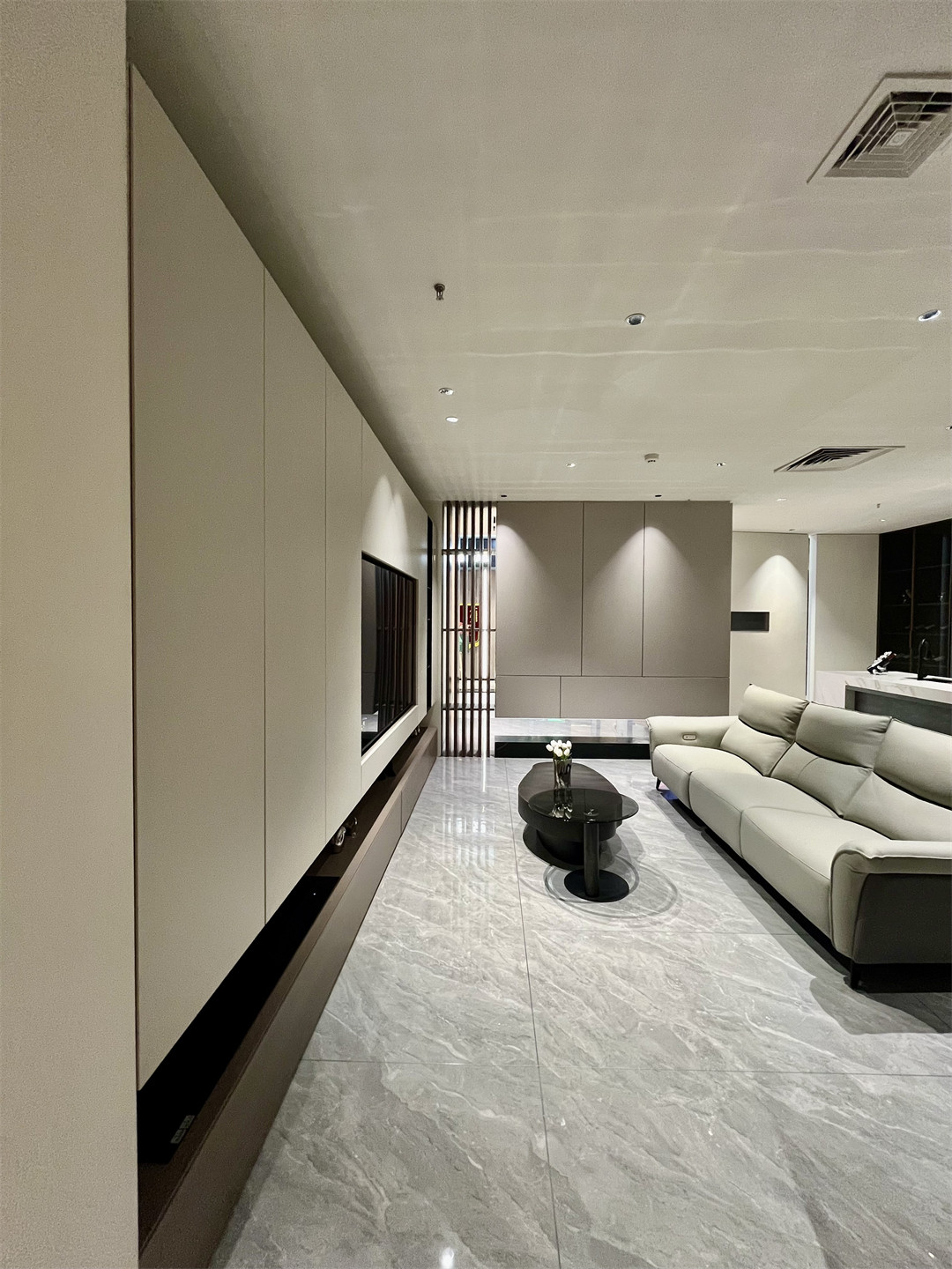 懸浮電視櫃+封閉式收納(nà)櫃+展示開放(fàng)層設(shè)計(jì),解決了客廳的儲物與展示需求鳴珂橡(xiàng)+光感白雙重配色設計,視(shì)覺的反差讓空間的層次感呼之欲出,客廳色彩層次更加豐富。創意芒果造型不(bú)鏽鋼茶幾組合高低錯落,將生活的感動化為細致的品位,塑造出專屬且獨(dú)一無二的人居(jū)形態。