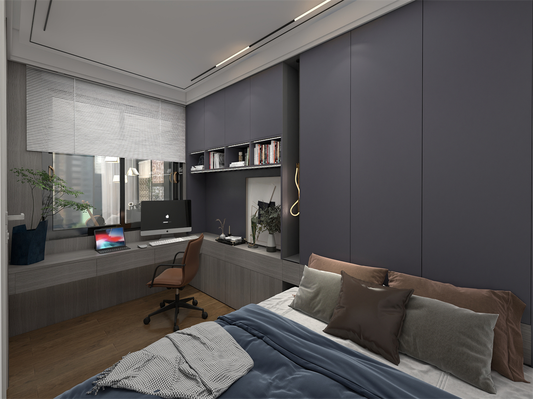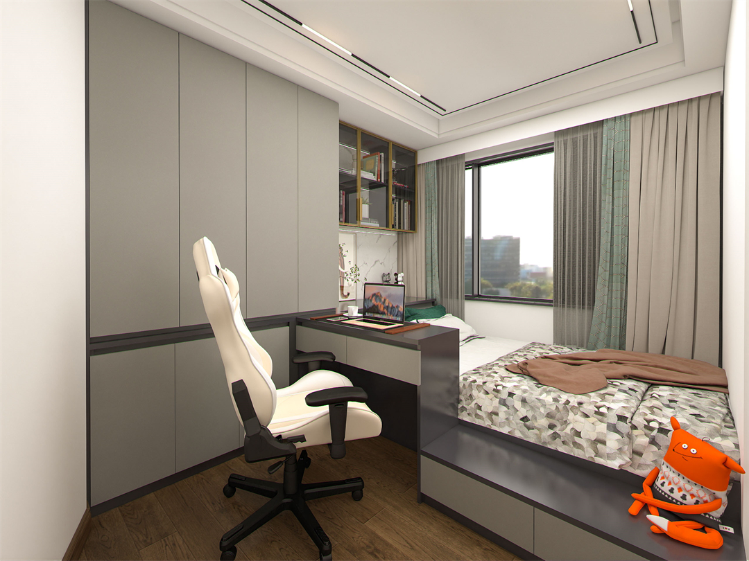兒子房居室(shì)空間較(jiào)小,設計師經過綜合考慮後,在色彩上選用了(le)不會隨著孩子的長大(dà)而過時的(de)鳴柯橡+極光灰雙(shuāng)色設計。定製榻榻米(mǐ)搭配(pèi)半開放式展示(shì)櫃,與書桌進行一體化設計(jì),細致勾勒(lè)劃分動靜分區(qū),巧妙發揮空間的最大功能(néng)性,陪伴孩子(zǐ)的學習與成長。