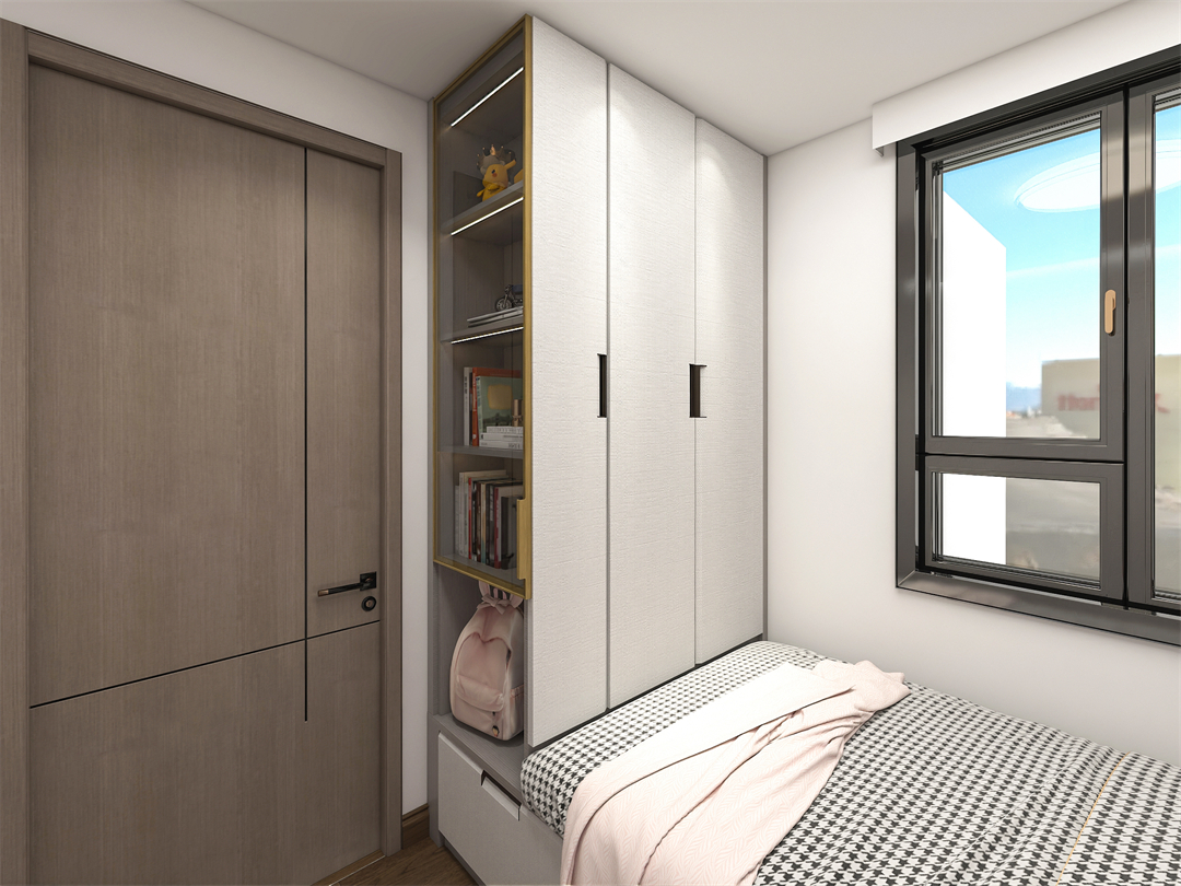多功能男孩房做榻榻米設計,將床、書桌、衣櫃(guì)和書櫃連為一體,讓小(xiǎo)小的臥室同時滿足學習、休息和收(shōu)納等成長性需求。一字型書桌將學(xué)習區與睡眠區有效隔開,半包圍結構超有安全感(gǎn)。床頭的極簡玻璃櫃則可以(yǐ)收納一些心愛的書籍、物件(jiàn),既(jì)能看得著,也不用擔心落灰。一房多用的男(nán)孩房,小空間也可以很溫暖。