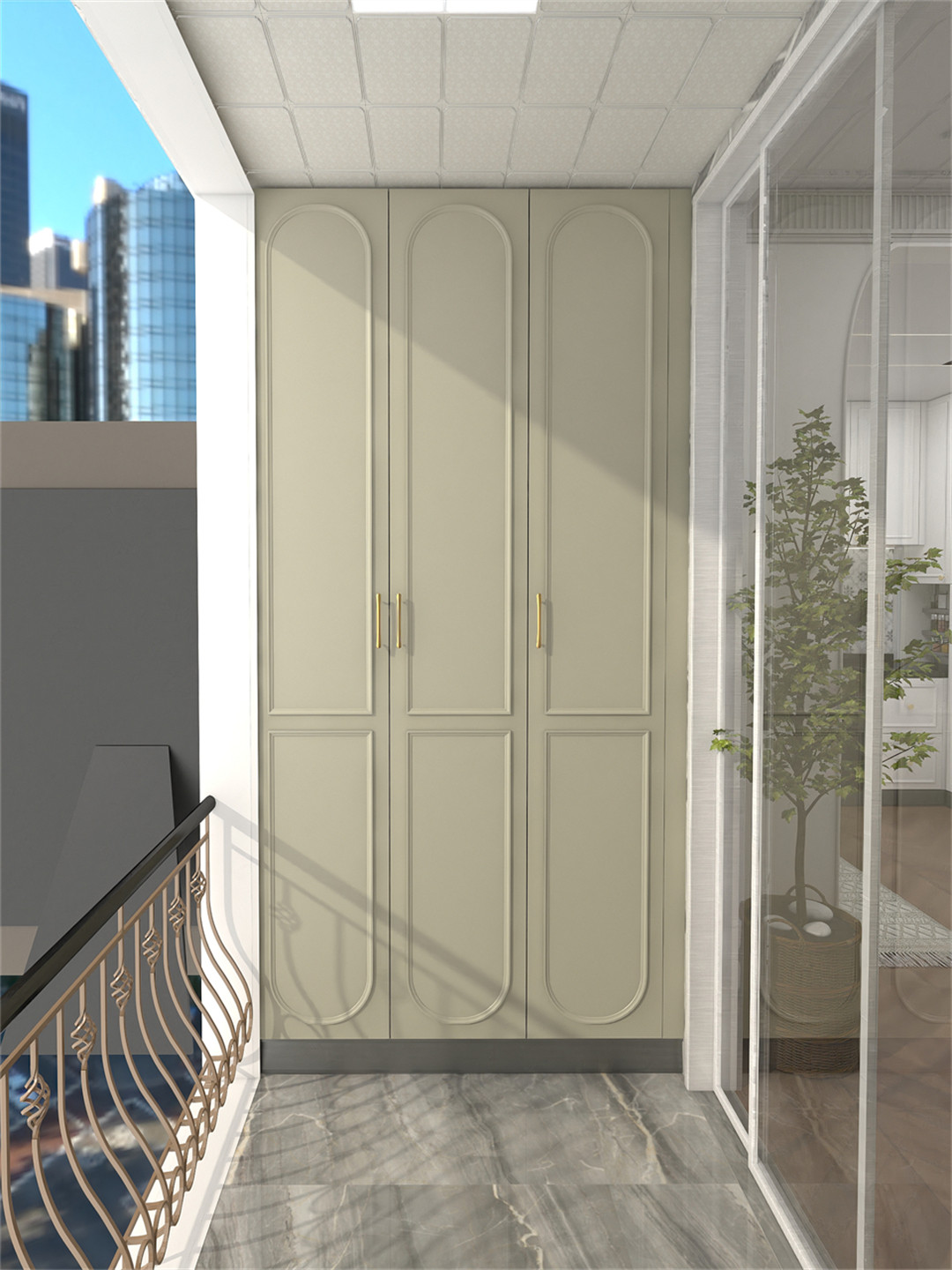 陽台空間設計超高門儲物櫃,用於儲存各(gè)類生活(huó)用品。深邃平和(hé)的EO097--阿瑪尼(ní)豆綠櫃門+歐雲衫櫃身,配(pèi)合柔和的(de)弧形與圓形設計,形塑輕盈而優雅的法式氛圍。
