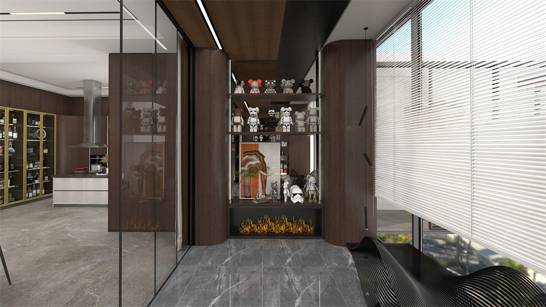 設計師將陽台與室內空間連通(tōng),左右兩側定製儲(chǔ)物櫃(guì),展示茶葉、藏品,在含蓄中表達主人對品(pǐn)質與(yǔ)細節的追求。大氣的刺胡桃圓弧櫃嵌入層(céng)板,與開放式展示櫃遙相呼(hū)應,舉目皆是氣質與大(dà)美(měi)。