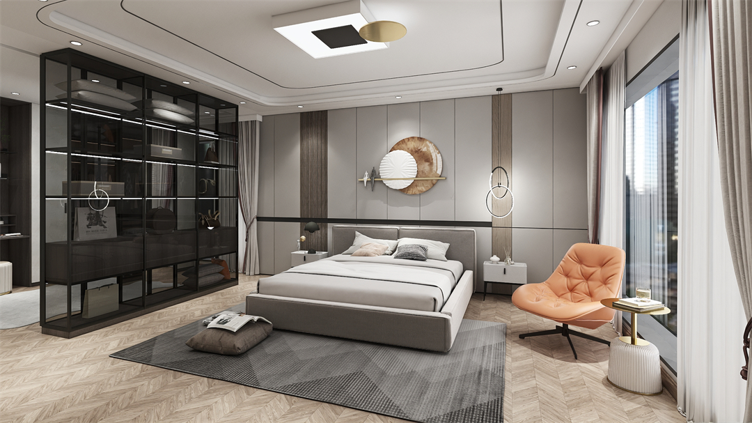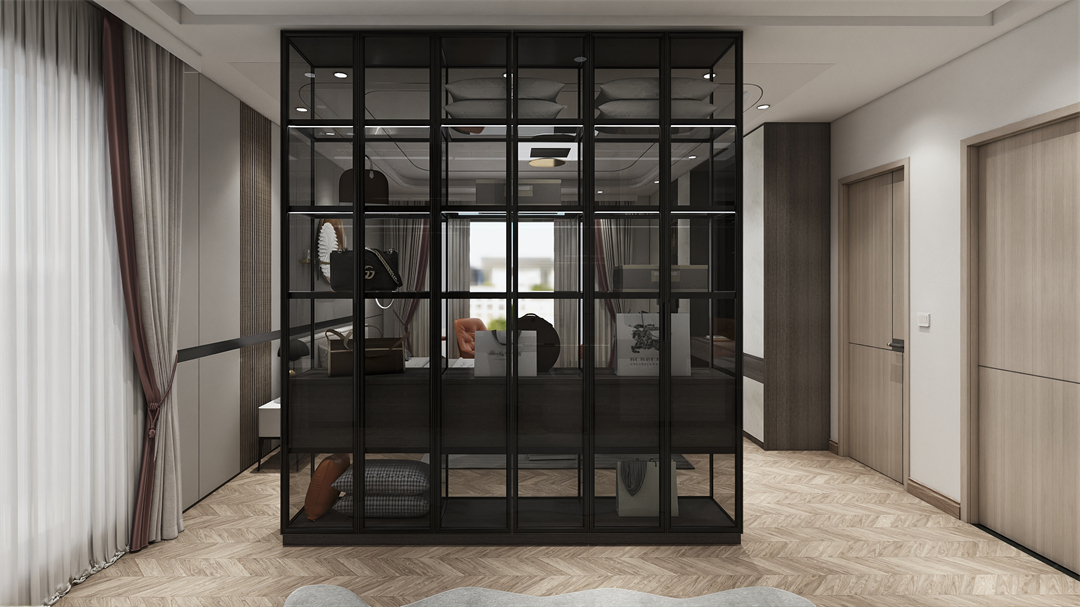 臥室與衣帽間之間設置一個玻璃隔斷櫃,將實用與美感作為空間第一著力點,集收(shōu)納與展示功能於一身。木色與玻璃隔斷櫃的碰(pèng)撞,隔而不斷,巧(qiǎo)妙劃分臥室空間,讓空間更(gèng)有層次感,打造悠閑安適的場域特(tè)性(xìng)。