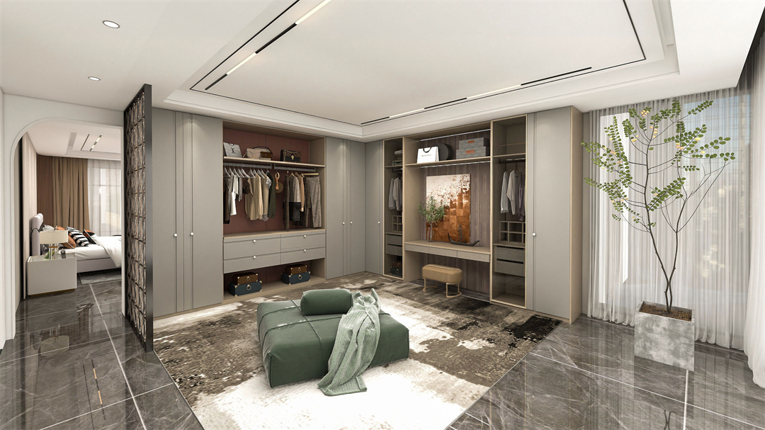 設計師通過精心設計的(de)隔斷,用定製衣帽(mào)櫃將臥室隔出一個L型衣帽間(jiān),既不會破壞整體性,又能輕鬆收納家人四季的衣物(wù)。雲禾木櫃體的衣帽間,結合(hé)最時尚(shàng)的功能五金,以及吉祥紅可見光背(bèi)板,可懸掛的(de)衣通與儲(chǔ)物櫃在深與淺的碰撞(zhuàng)中,造就一個詩意的儲藏空(kōng)間,治愈了生活中的淩亂與不安。