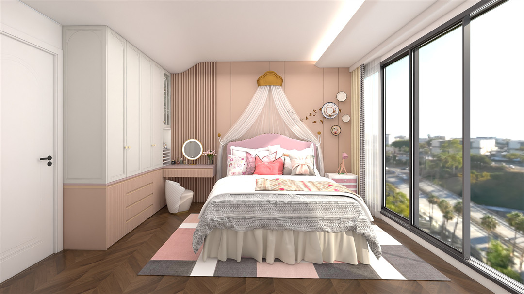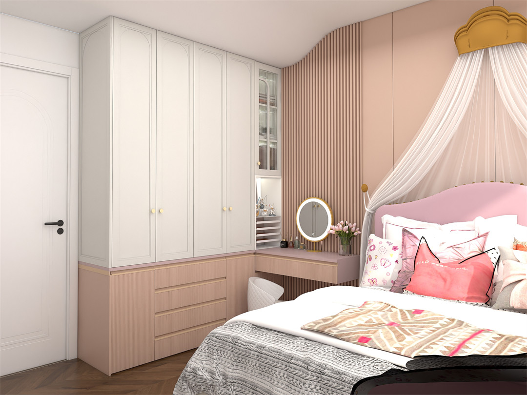 基調更加偏向活潑的女兒房,衣櫃+梳妝台一體式定製櫃,有效利用空間(jiān),讓空間更具整體性。