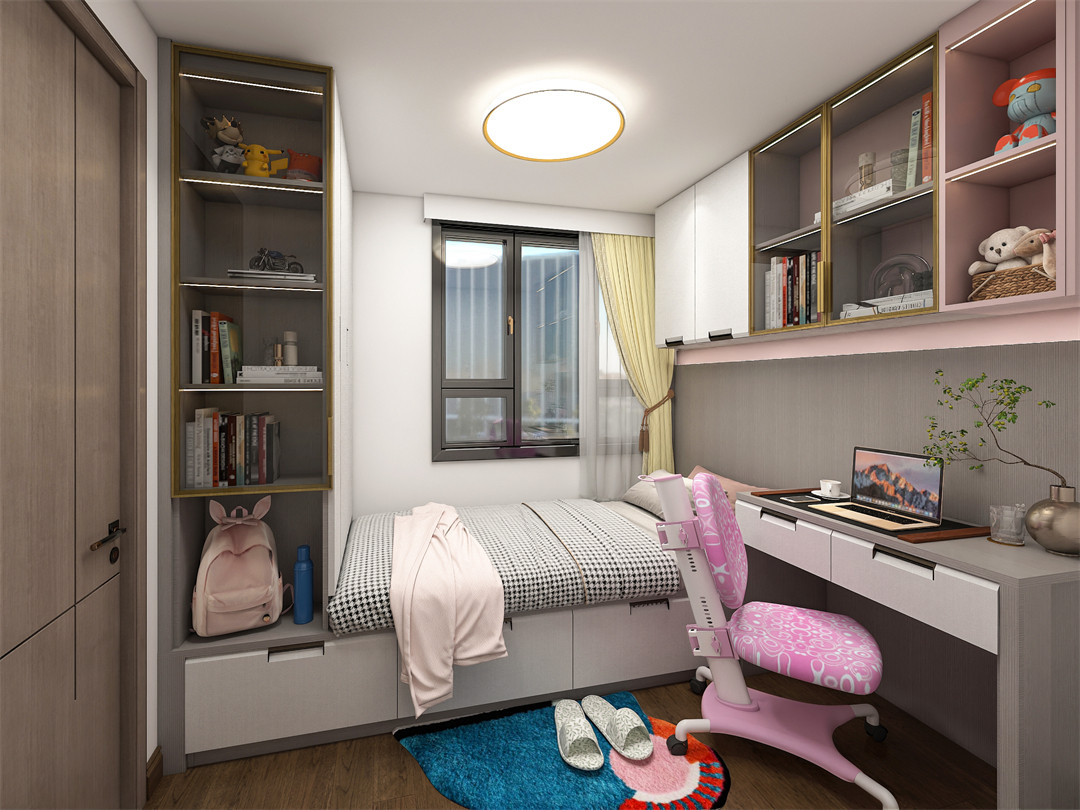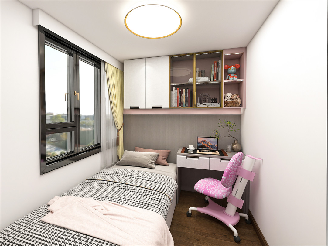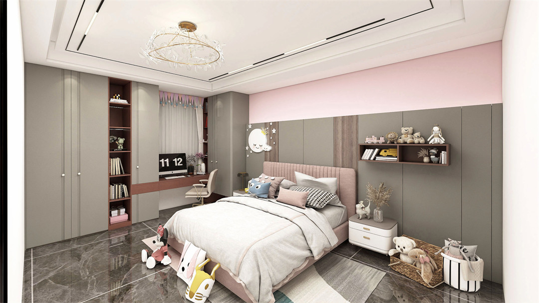 女孩(hái)房色調采用羅馬灰和吉祥(xiáng)紅,掩映著(zhe)柔和的粉色色(sè)調,貼心(xīn)匹配小(xiǎo)女(nǚ)孩活(huó)潑(pō)可愛的格調喜好。書桌櫃的量身定製設計,功能上滿足了女孩收納、休息與學(xué)習的需求。
