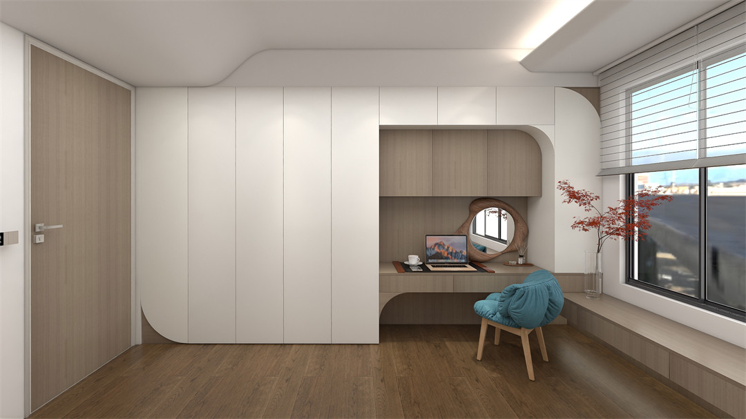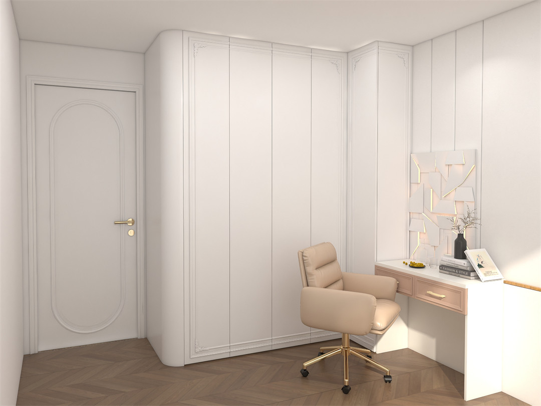 淡淡的白色(sè)亮光衣櫃門在空間中肆意蔓延,搭配童趣的圓形切角造型板,為空間增添柔和感(gǎn)和趣味性。衣櫃+書櫃+梳(shū)妝台一體化多功能設計,打造超強收納(nà)空間的同時,也為孩(hái)子成長過程中的活動範圍最大化提供多元相伴。