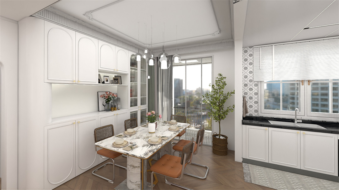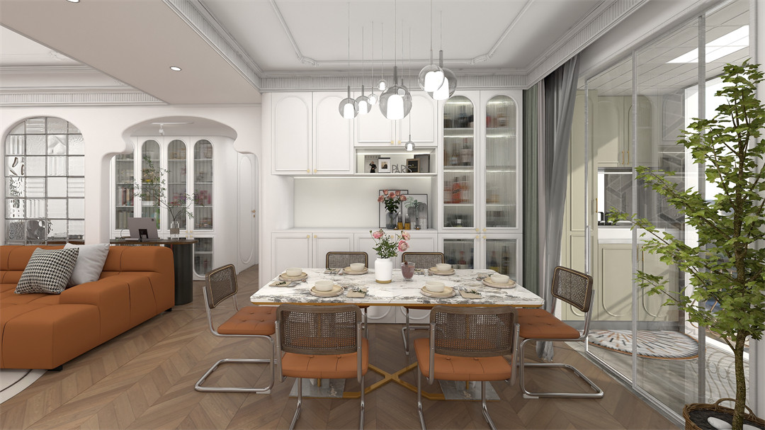 餐邊(biān)櫃的基材以奶油白和阿瑪尼白為主,配以精致的金(jīn)屬(shǔ)拉手,氛圍感直接拉滿(mǎn)。封閉櫃、開放(fàng)櫃有機組合,櫃子內嵌燈帶設計,搭配法(fǎ)式經典弧型長虹玻璃門,將雅致和浪漫無界銜接(jiē),開啟(qǐ)超越的生活方式(shì)。