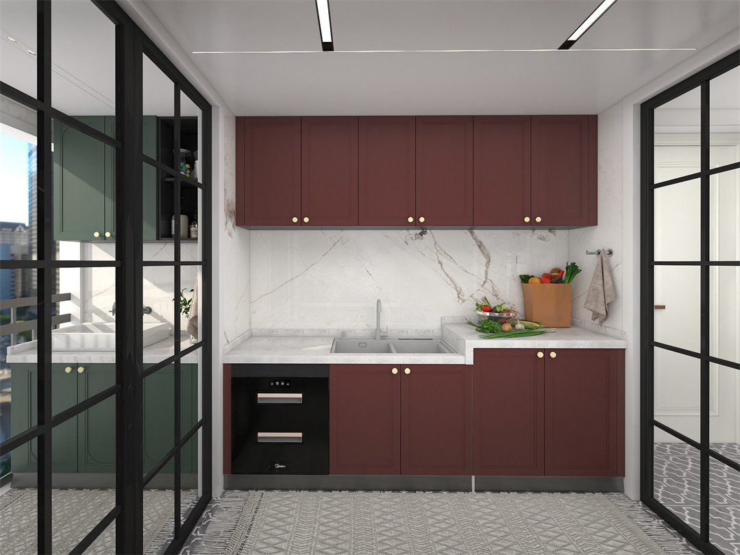 型廚房分布,讓烹飪與(yǔ)洗滌分區(qū)進行,互無(wú)幹擾。EO100-01-阿瑪尼紅矩(jǔ)形吊櫃/地櫃門板、不鏽鋼消毒櫃、冰淩台麵等不同材質相互碰撞,營造出與眾不同的(de)空間(jiān)魅力,賦予廚(chú)房溫暖的生活氣息。
