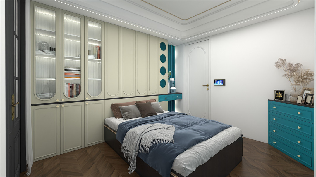 以親和(hé)力(lì)十足的EO097-阿瑪(mǎ)尼深藍高門,搭配質感(gǎn)拉手,讓整個空間充滿安寧感和設(shè)計感。到頂式衣櫃容量豐富,輕鬆裝下家人不同時期的衣物,有顏又實用讓生活空間回歸安寧無雜。